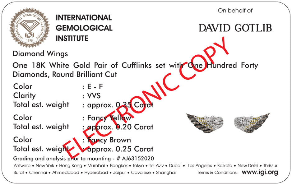 Every pair of cufflinks is delivered in our distinctive premium box, accompanied by its IGI certificate, ensuring unparalleled quality and authenticity.
