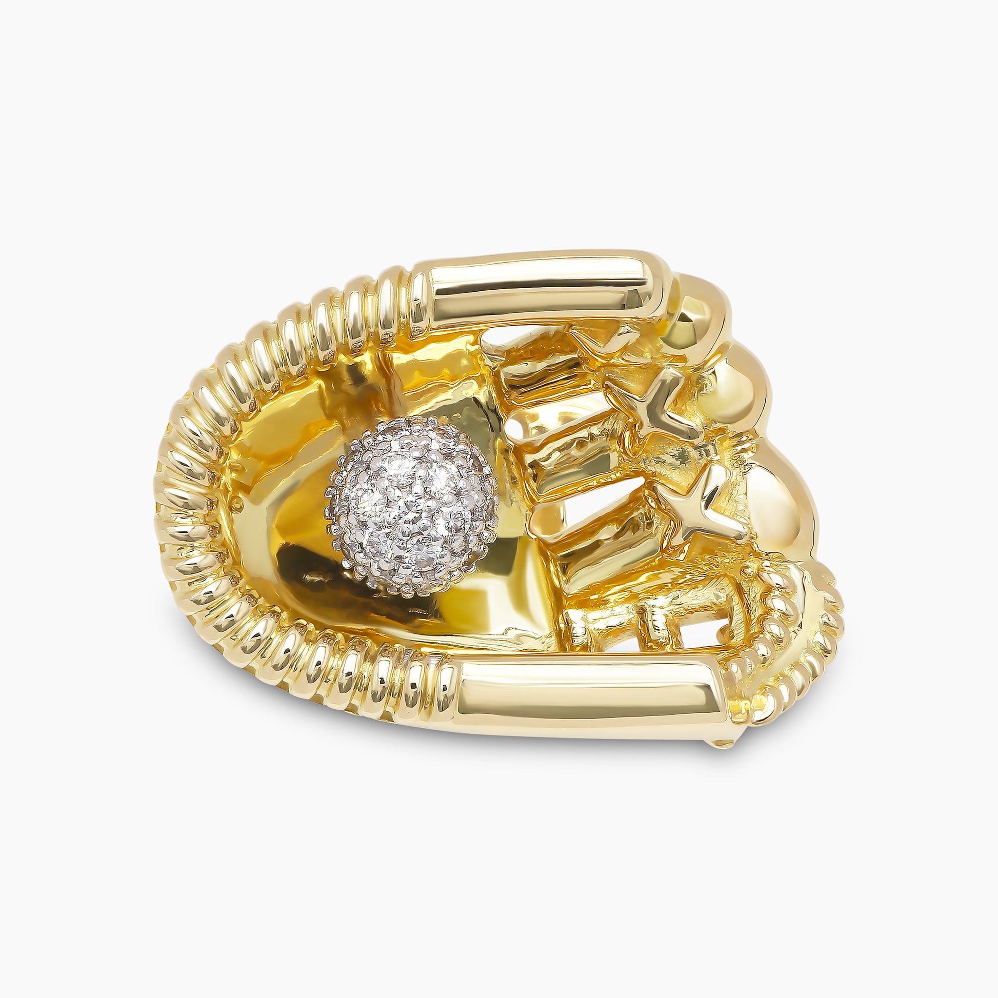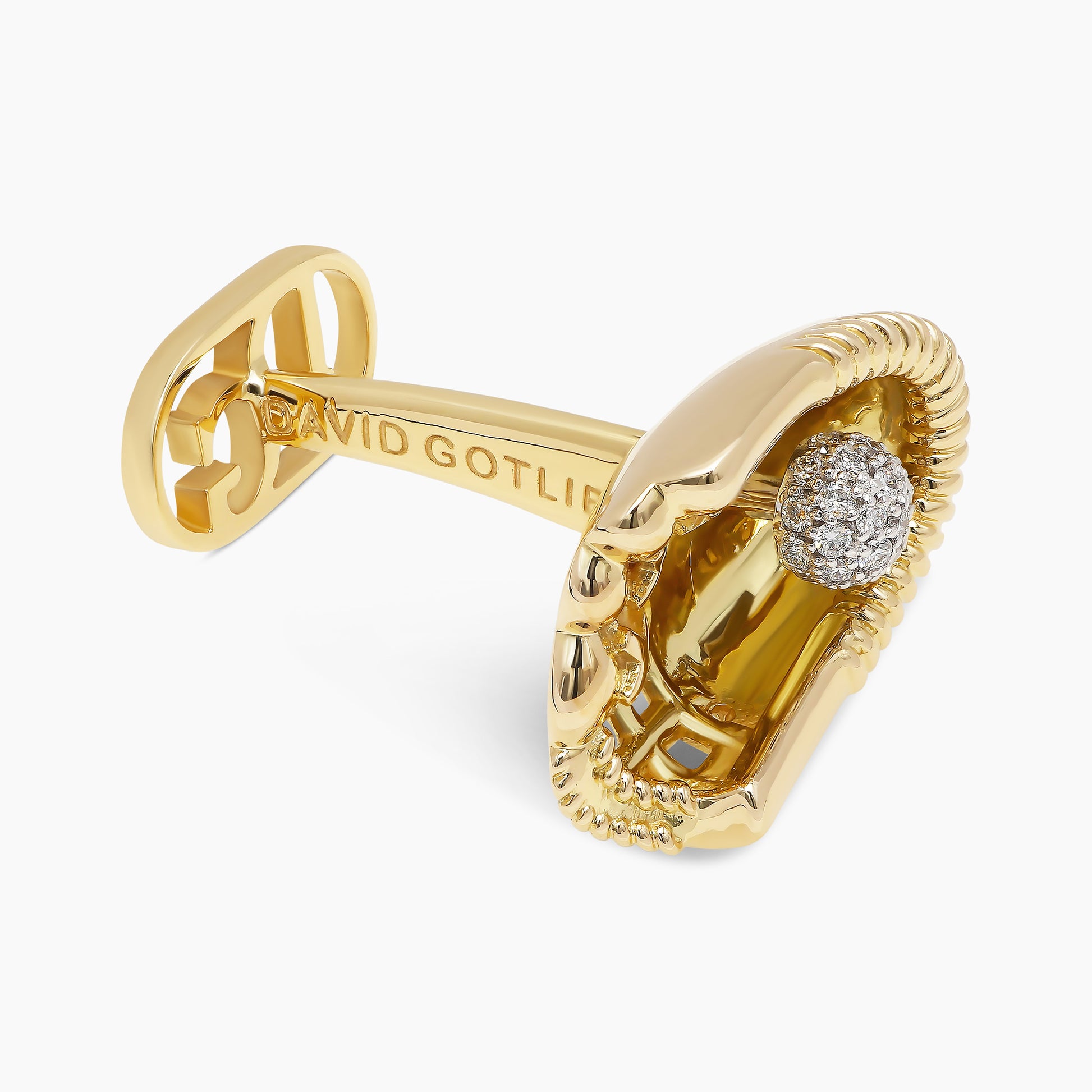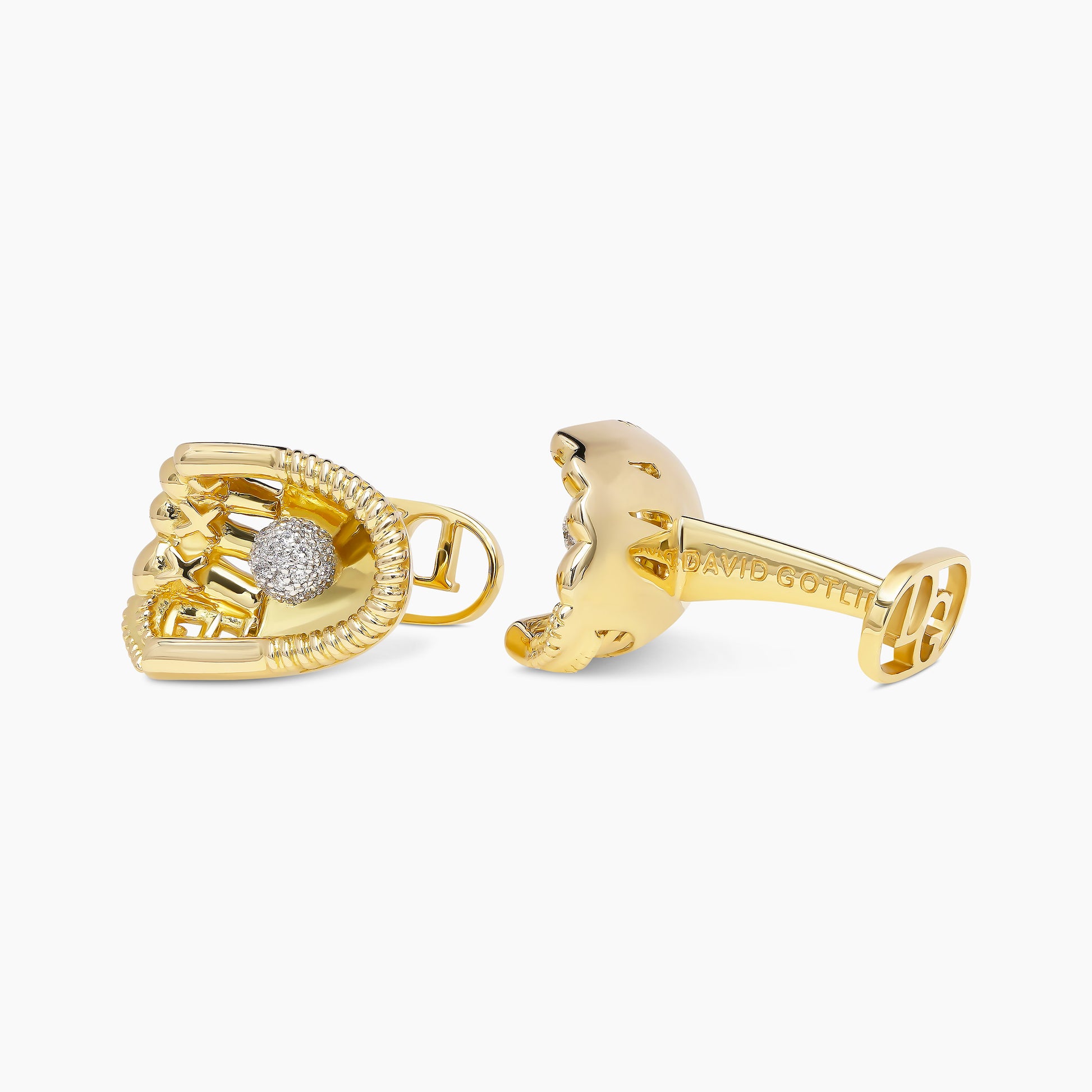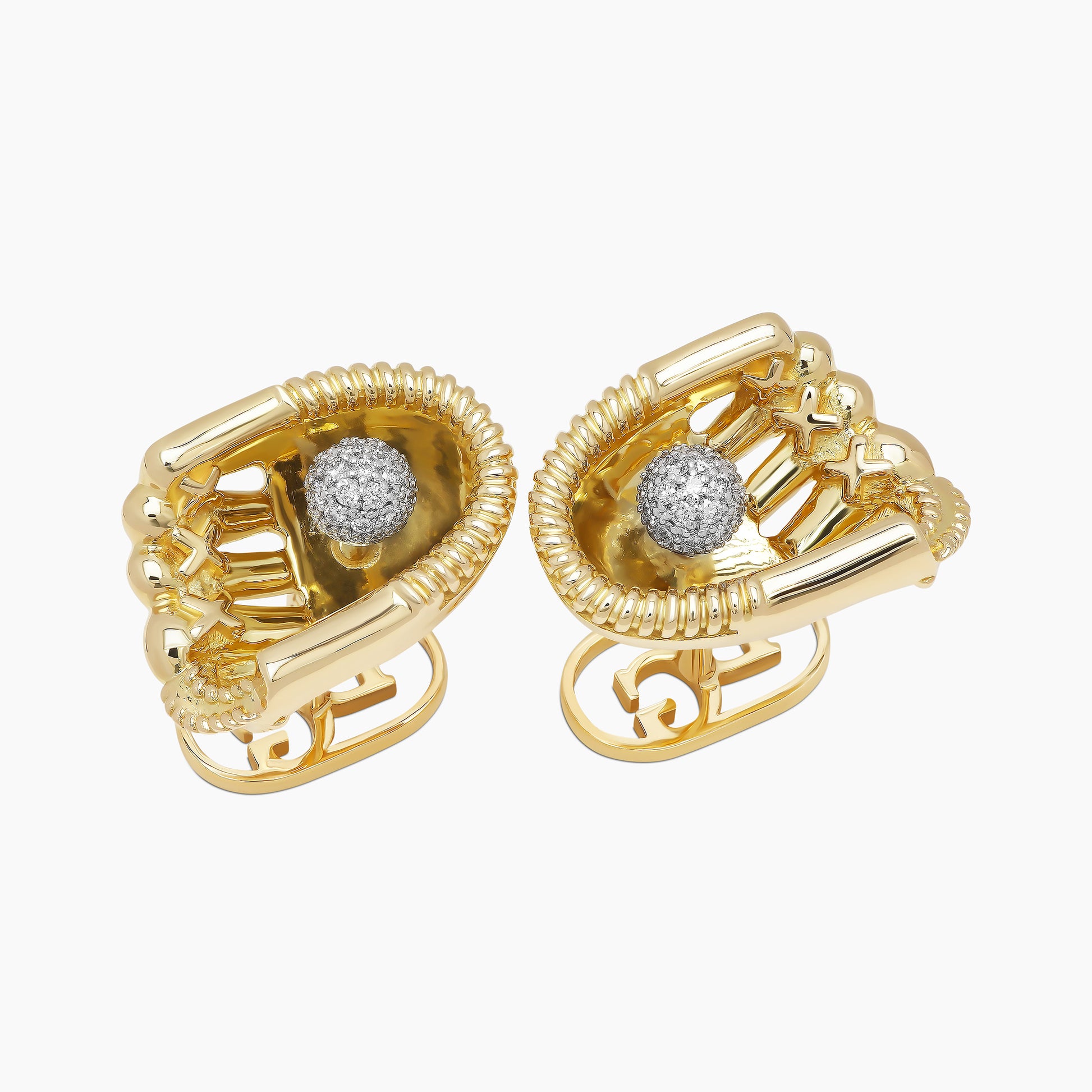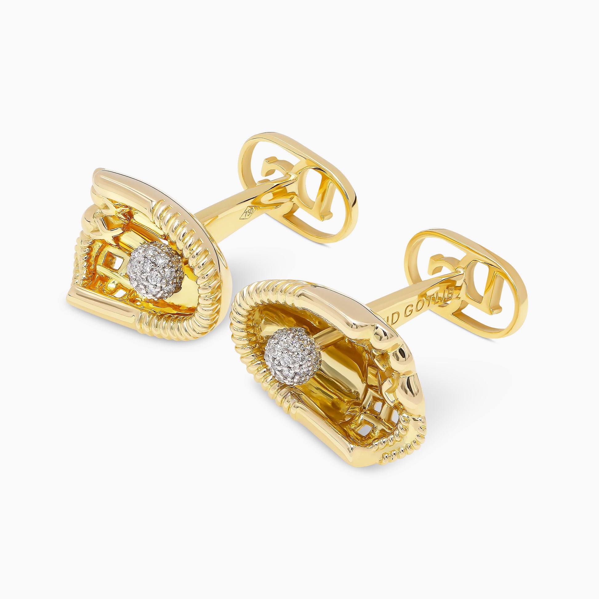 These 18k yellow gold cufflinks, designed by DG, feature a baseball glove gently holding a ball, adorned with 54 white round brilliant diamonds. They merge the thrill of the game with a luxurious elegance, perfect for those who appreciate both sport and fine craftsmanship.