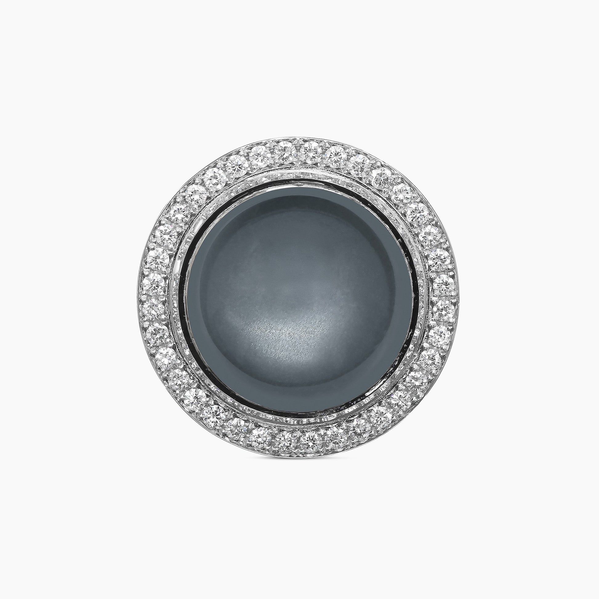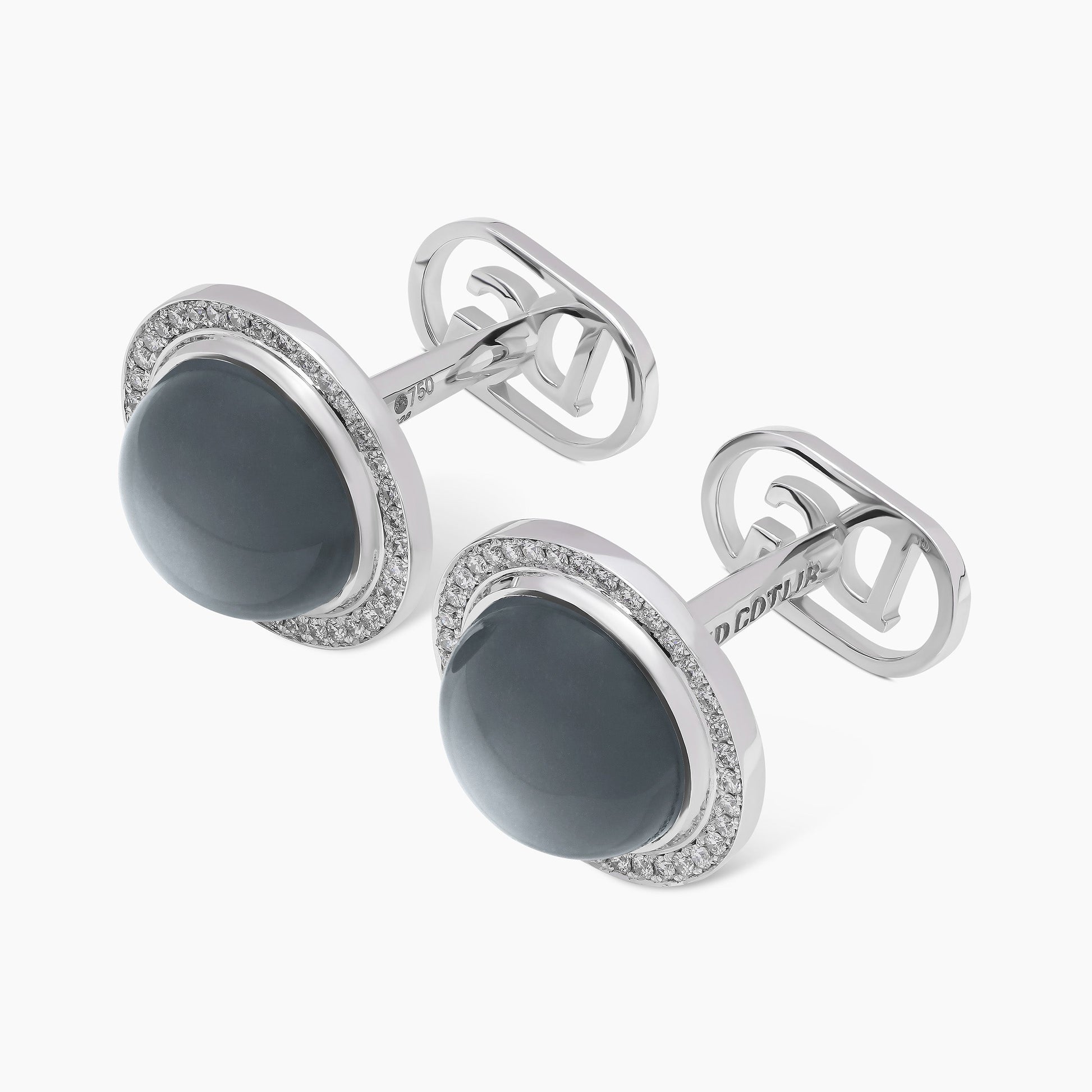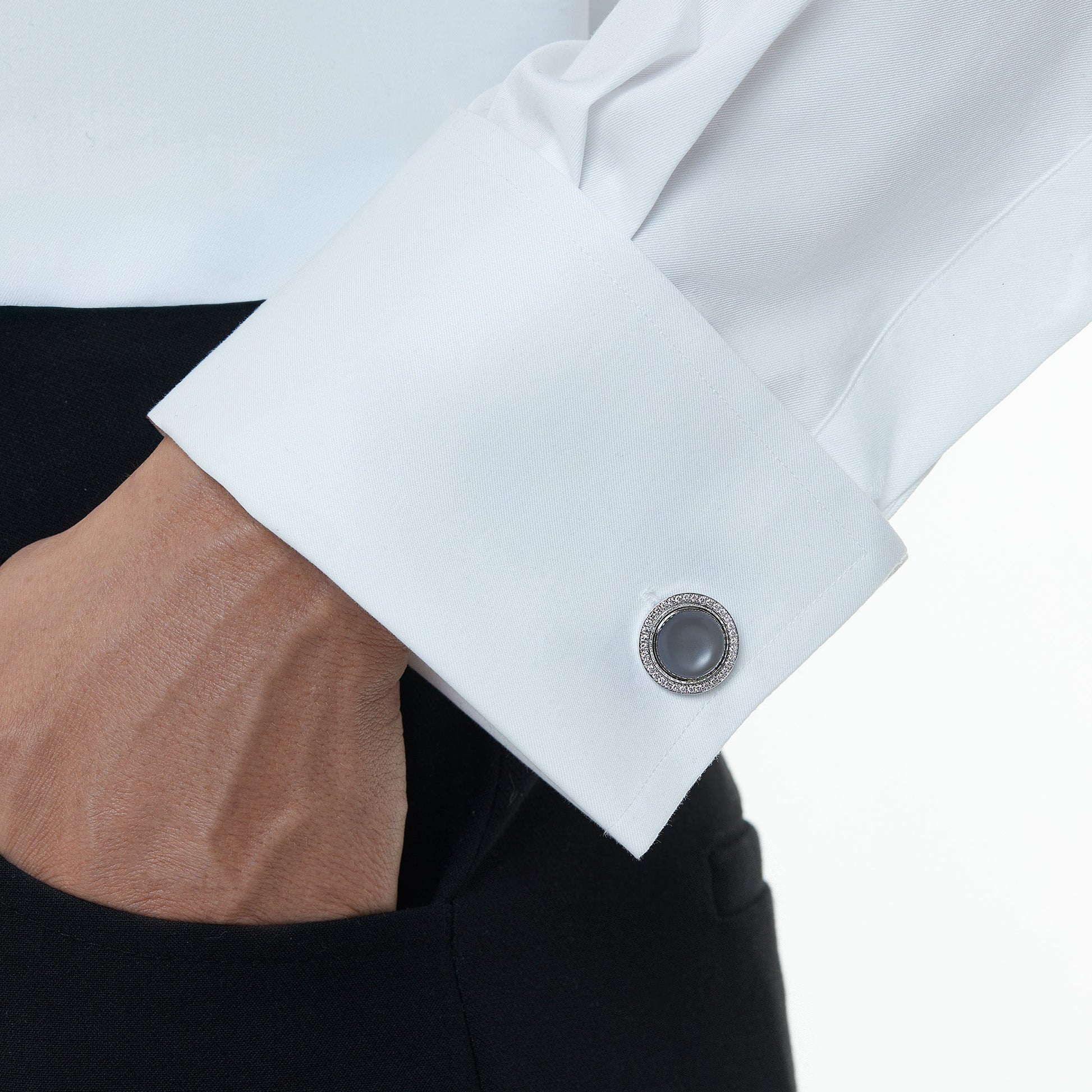 Featuring two luminous gray moonstones, these cufflinks are reminiscent of the moon’s gentle reflection, set in 18kt white gold and encircled by 72 round brilliant white natural diamonds, endlessly evoking the moon’s ever-changing, renewing allure. A perfect harmony of nature’s elegance and timeless beauty.
