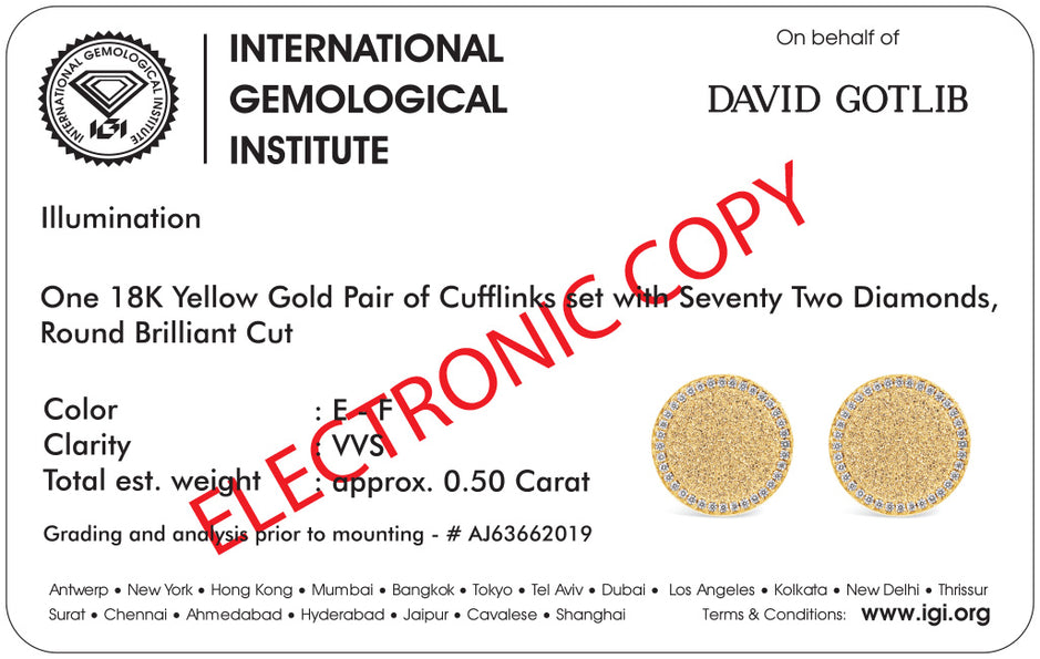 Every pair of cufflinks is delivered in our distinctive premium box, accompanied by its IGI certificate, ensuring unparalleled quality and authenticity.