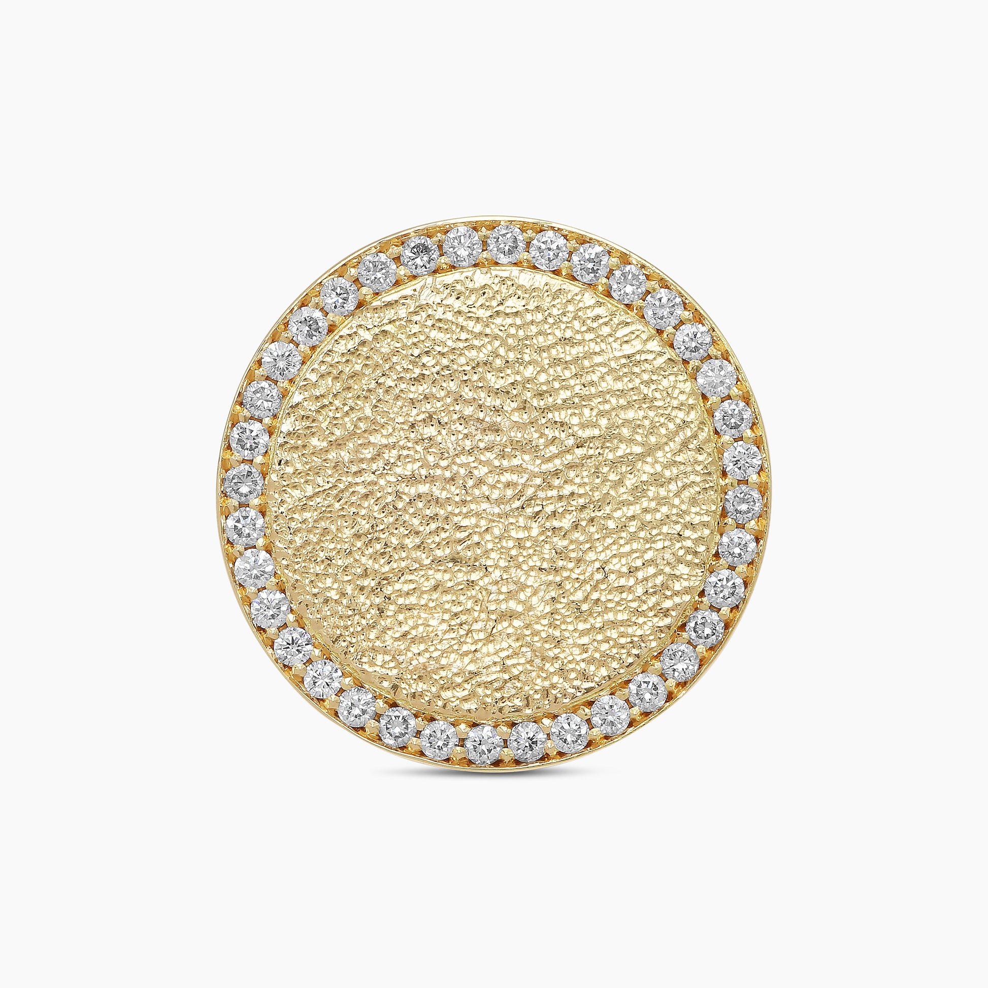Radiating the sun’s brilliance within a perfect 18kt gold circle and illuminated by 72 natural diamonds, the hammered finish imbues the gold with vibrancy, creating a harmonious balance of shimmer and vitality.