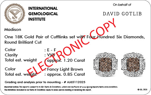 Every pair of cufflinks is delivered in our distinctive premium box, accompanied by its IGI certificate, ensuring unparalleled quality and authenticity.